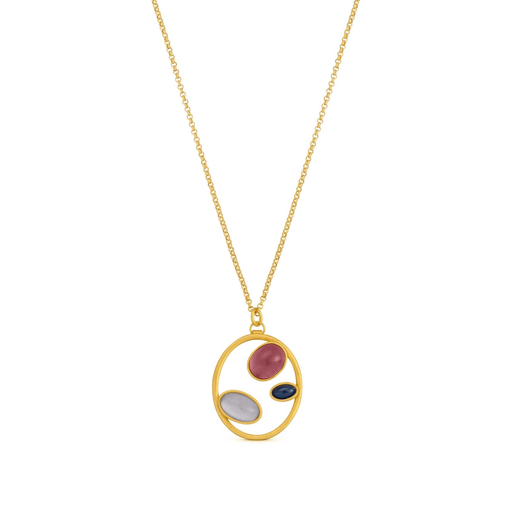 Necklace made up of a small, irregular circular pendant featuring three handmade Murano glass pieces in blue and pink. Piece made of 24 K gold-plated matte metal. Gold chain with lobster closing and extension chain.