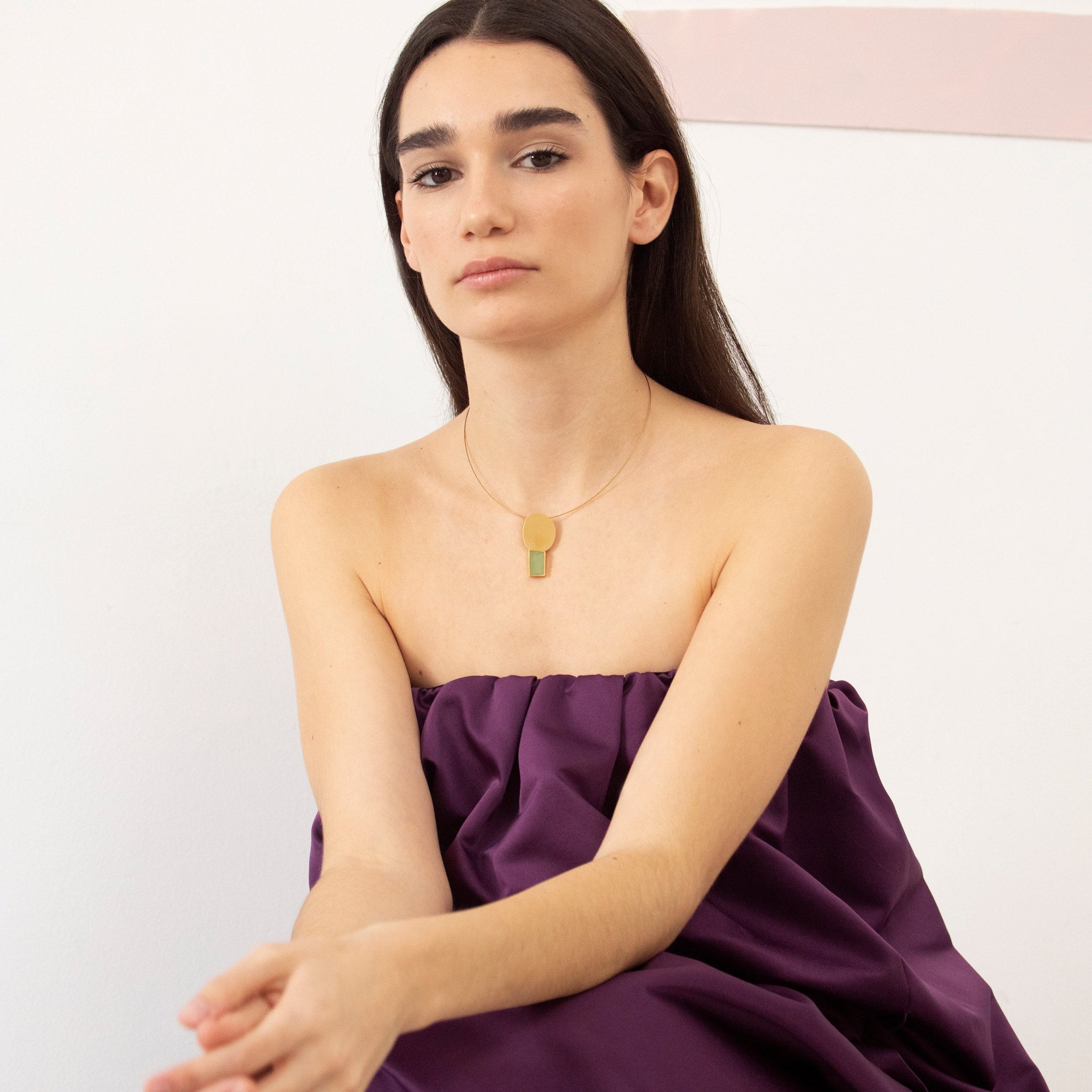 Necklace with a large pendant made up of two imperfect geometric shapes that combine randomly. Piece made of 24 K gold-plated matte metal and green enamel. Steel cable with lobster closing and extension chain.